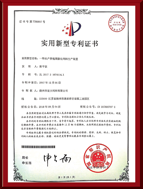 揚(yáng)州市宏大飼料有限公司 揚(yáng)州市宏大飼料有限公司是一家集科研與生產(chǎn)為一體的大型民營企業(yè),座落在魚米之鄉(xiāng)高郵東郊,傍依郵興公路、澄子河,水陸交通便捷,于2002年建成投產(chǎn),占地面積60畝,固定投資1.5億元?,F(xiàn)有7條生產(chǎn)線,其中時產(chǎn)15噸高檔水產(chǎn)膨化生產(chǎn)線2條,均采用國內(nèi)先進(jìn)的真空后噴涂技術(shù)和低溫烘干技術(shù)(飼料內(nèi)的各種營養(yǎng)不受破損)、臺灣宜大高檔蝦料生產(chǎn)線2條和魚飼料生產(chǎn)線3條。